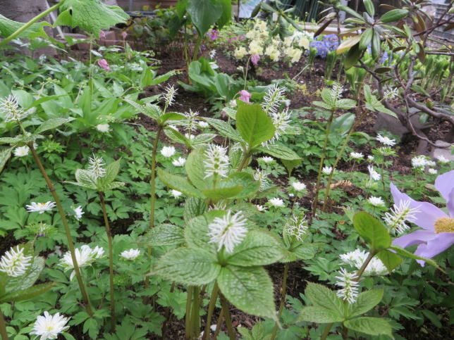 紫の蕾が出て色の濃いシラネアオイが三輪咲いた