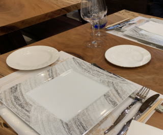 テーブルも食器も料理の素材こだわってるマスター
