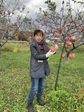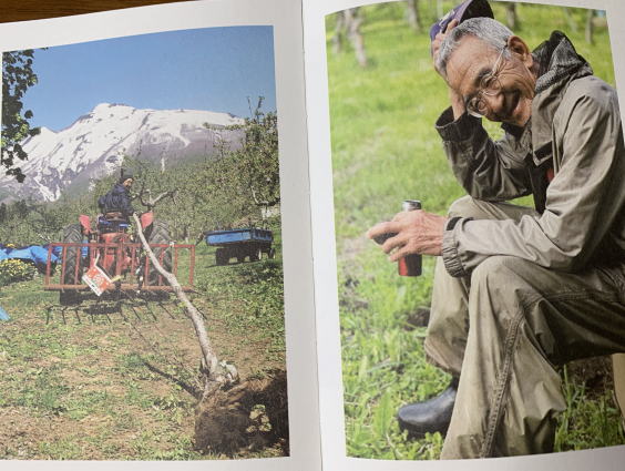 いつもりんごもぎしてから畑でリンゴ箱に座りながらお茶して