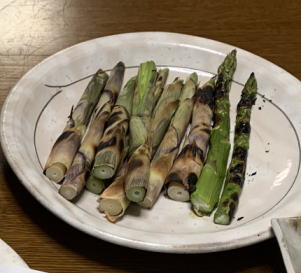 家のアスパラや頂いた根曲がりだけなどを焼いたり天ぷらにしたり